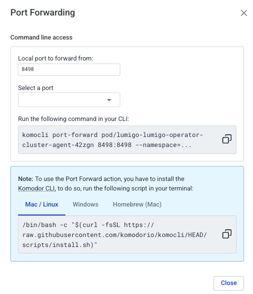 komocli port-forward pod/mypod 5000 --namespace default --cluster my-cluster --token=...Examples: