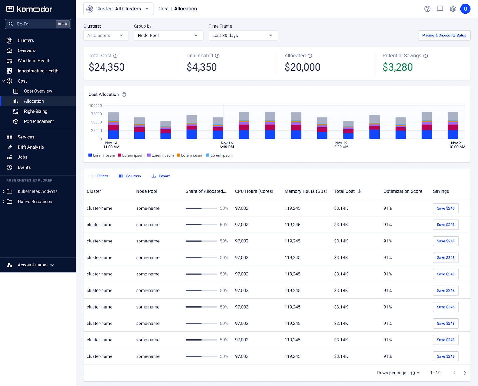 The Cost Allocation page in Komodor gives you precise insight into how your Kubernetes infrastructure spend is distributed - by cluster, namespace, or service.