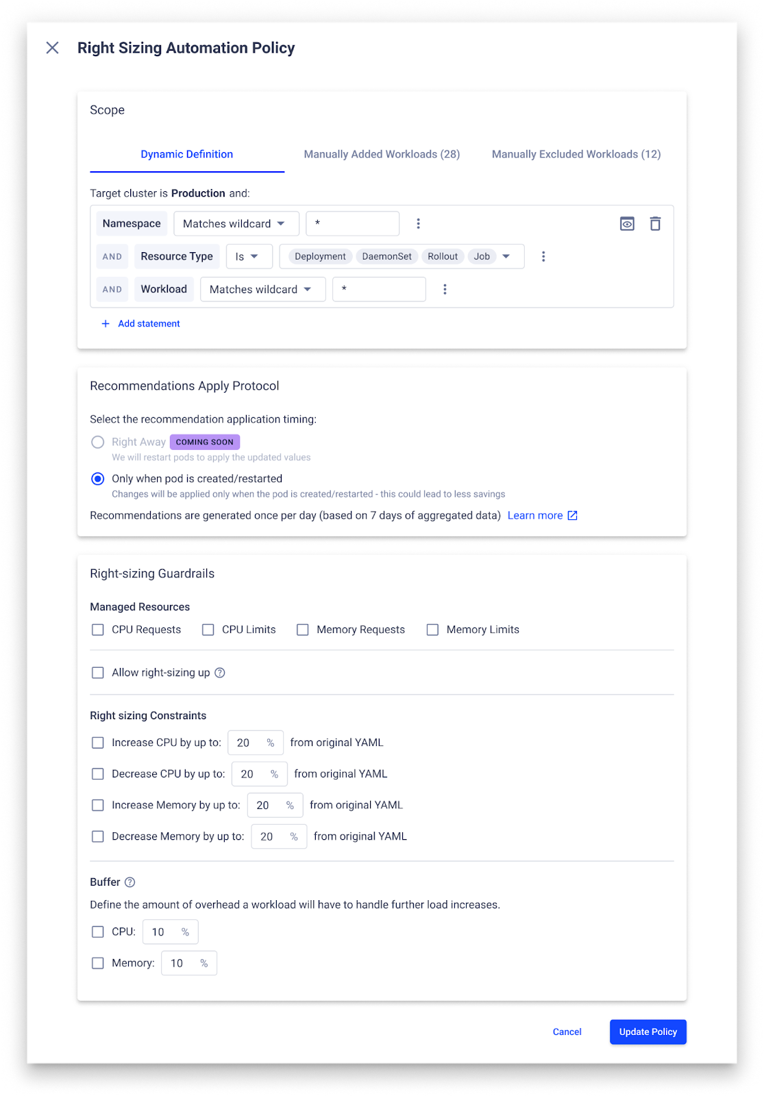 - Option to configure the rightsizing policy