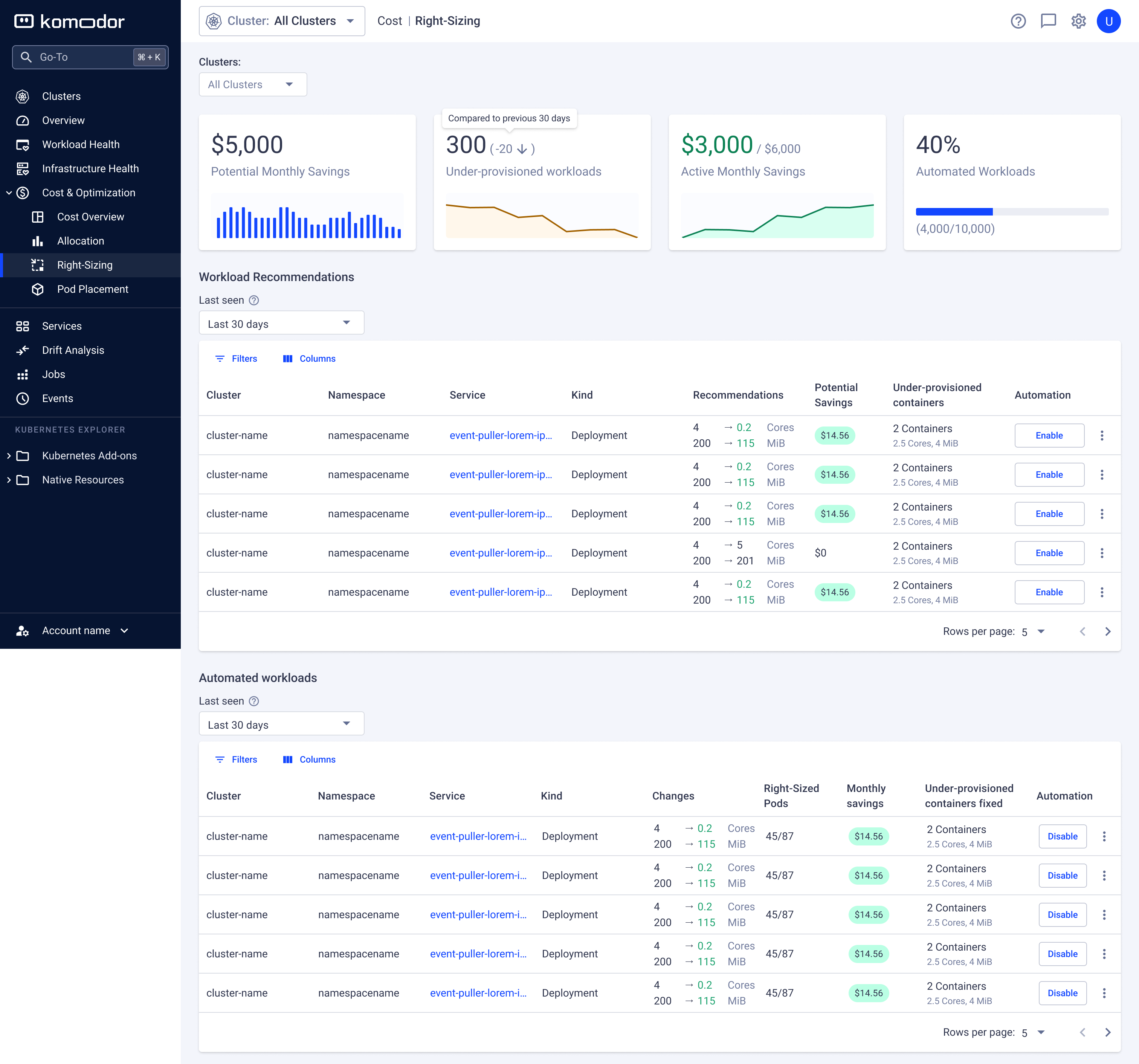 The Rightsizing dashboard has two main tables: