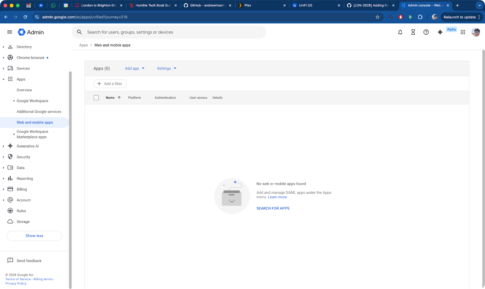 In the Google Admin console, browse to Apps > Web and mobile apps as shown below