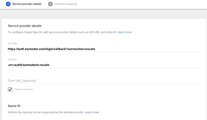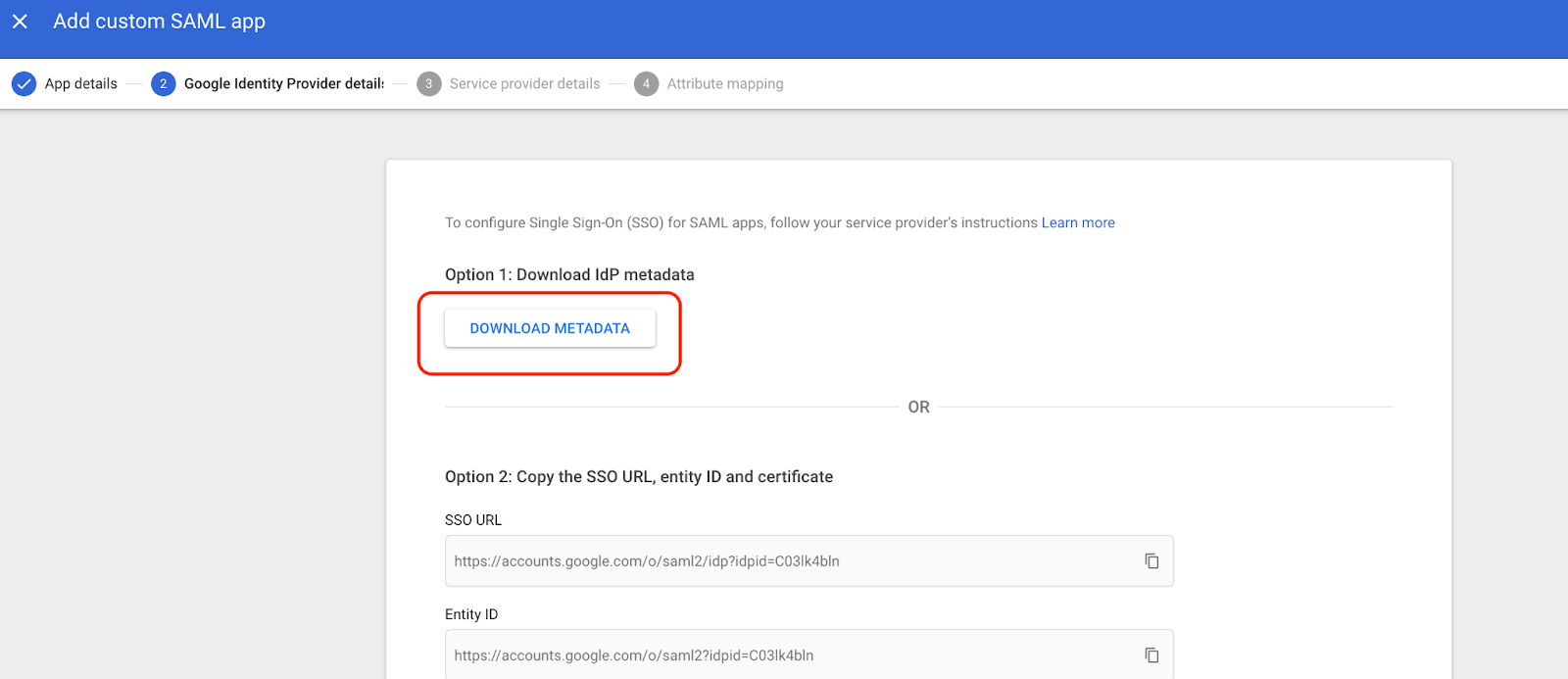 Under Google Identity Provider details, select to DOWNLOAD METADATA and share the file with Komodor. Leave the default options for SSO URL and Entity ID. Click on CONTINUE.