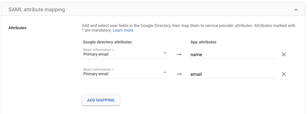 Under Attribute Mapping, set up mapping attributes as shown below: