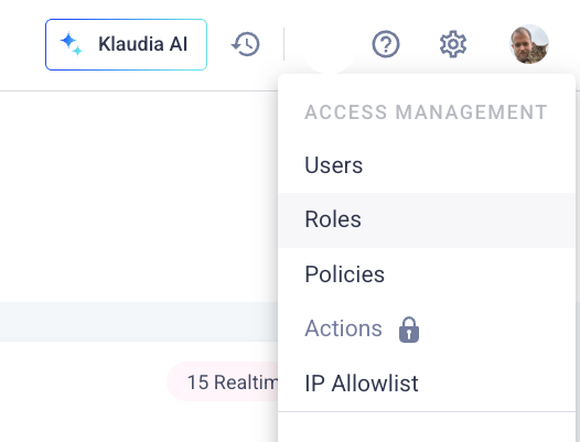 The last step is to create a corresponding role in Komodor. The role in Komodor has to match the Google Group (or one of them). For example, in the screenshot above, we have a Google Group called Security. In Komodor, we would then create a role called Security. To create a new role, click on the gear iconand select Roles as shown below.
