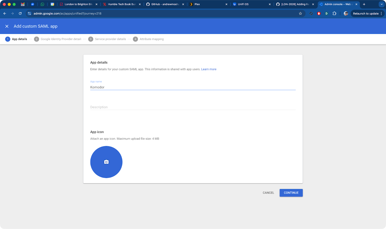 Under App details, enter a name and optionally a description and icon and click on CONTINUE