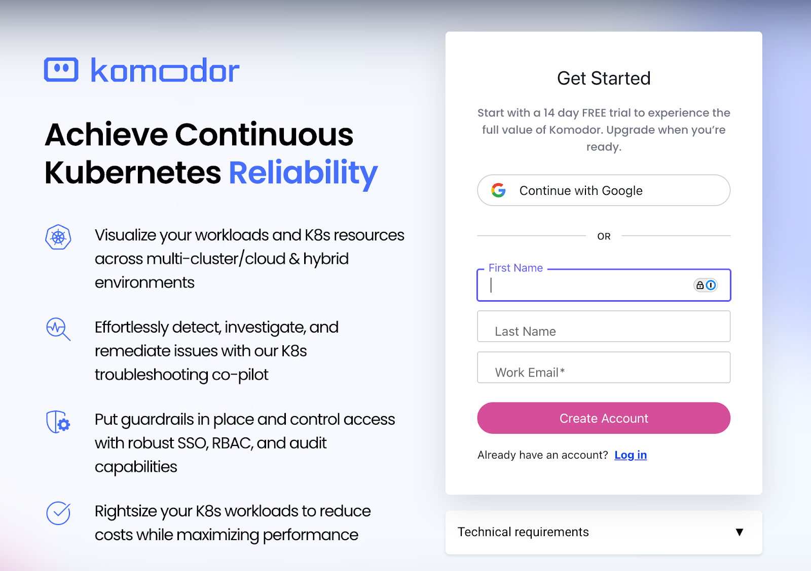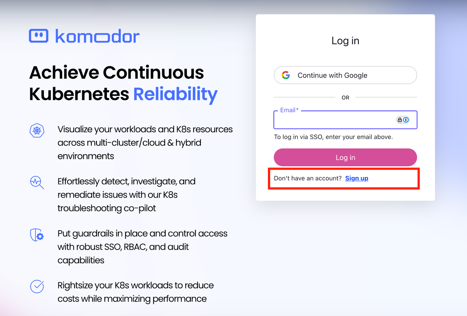 - The initial signup here creates both the organizational Komodor account, as well as the user’s personal account.